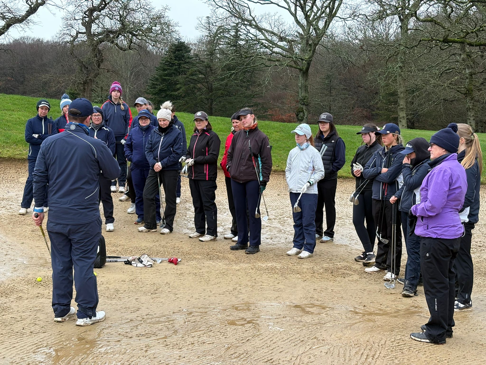 After a short break for lunch we again ventured outside and split into 2 groups. A par 16 chip and putt was held on the chipping green and Jack set up various drills on the putting green. The day culminated with a bunker clinic led by coach Jack. The whole group were able to descend onto and into the West course 18th bunker to follow the clinic.